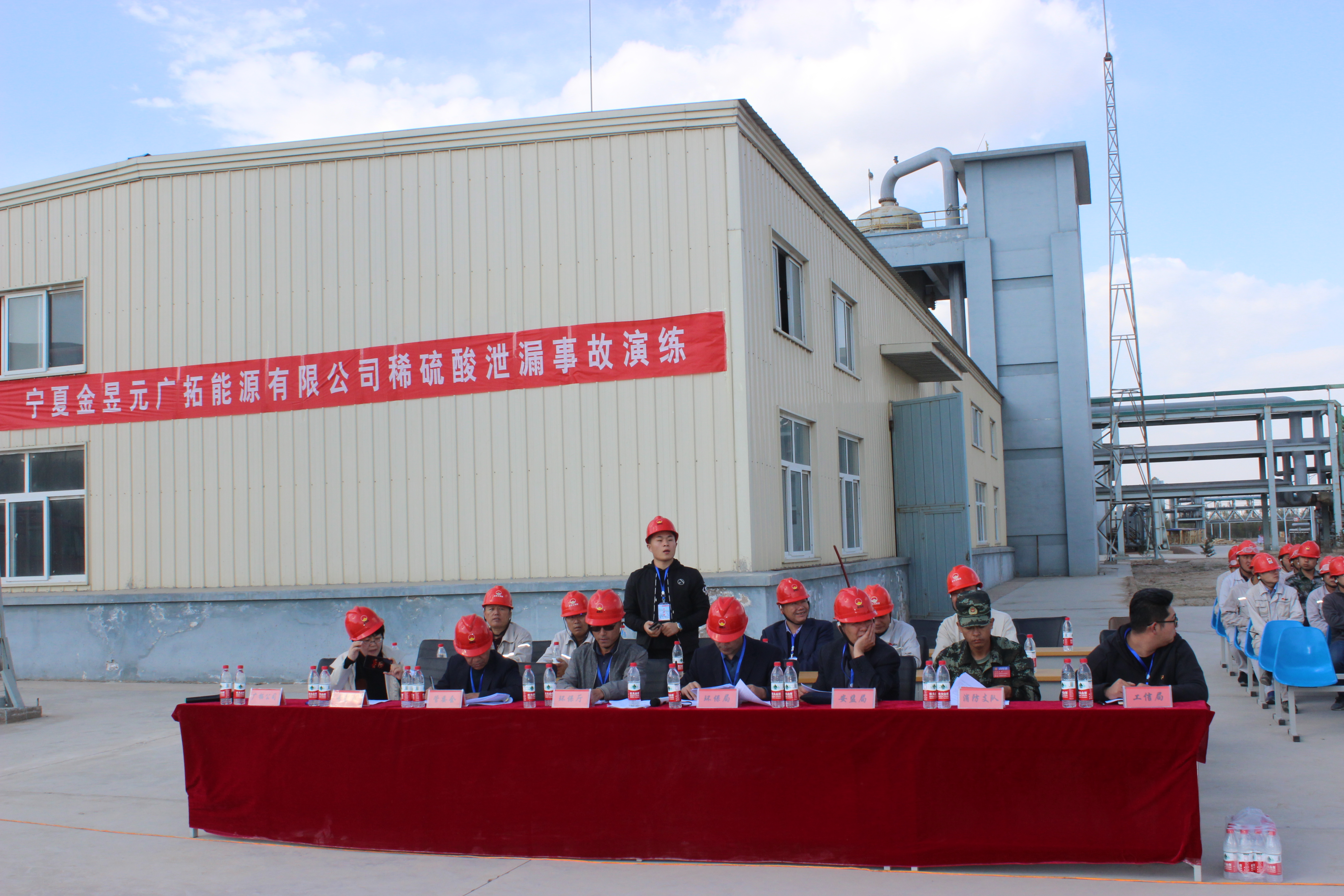 為有效應(yīng)對各類突發(fā)性環(huán)境污染事件,妥善處置次生環(huán)境污染,進(jìn)一步提高操作人員處理突發(fā)環(huán)境事故的應(yīng)急能力。2018年10月11日下午15時,由固原市環(huán)保局主辦,寧夏金昱元廣拓能源有限公司承辦,在化工公司廢硫酸回收處理裝置北側(cè)小廣場,舉行了稀硫酸泄漏較大環(huán)境事故應(yīng)急演練。