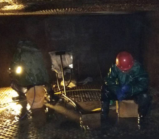 因2#鍋爐上下級(jí)空預(yù)器堵塞嚴(yán)重,無法滿足生產(chǎn)負(fù)荷要求,影響鍋爐正常運(yùn)行,2019年1月14日9點(diǎn)30分,根據(jù)公司停車檢修計(jì)劃,對(duì)2#鍋爐空預(yù)器管進(jìn)行清洗及疏通,首先在煙道底部制作排水口,引至地溝,保證現(xiàn)場(chǎng)路面無積水及結(jié)冰,待空預(yù)器內(nèi)溫度下降,公司領(lǐng)導(dǎo)組織崗位人員輪流進(jìn)入空預(yù)器清理積灰,為空預(yù)器管道清洗及疏通做好各項(xiàng)準(zhǔn)備工作,15日正式使用清洗機(jī)對(duì)空預(yù)器進(jìn)行帶壓清洗,所有人員不怕苦、不怕累、放棄休息時(shí)間協(xié)助外包人員及時(shí)疏通空預(yù)器堵塞管道,更換空預(yù)器套管,檢修人員雖然穿著厚厚的棉衣,但不一會(huì)也被寒冷打透。手凍僵了,他們搓了搓接著干。