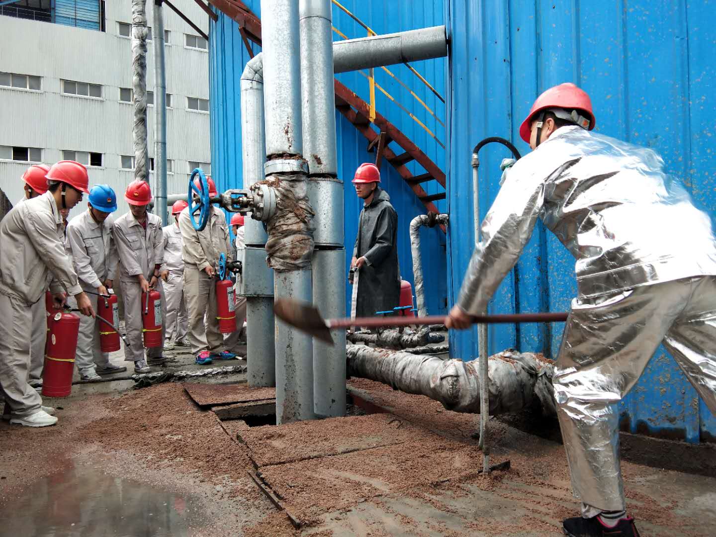 演練是以2#油罐回油管閥門前法蘭漏油,造成回油閥下方回油管道保溫棉浸油,導(dǎo)流溝內(nèi)少量積油,遇高溫引起火災(zāi)的模擬情景演練。演練過程中,各職能機構(gòu)按照預(yù)案要求及時、有序、緊密配合,堅持“把演練當(dāng)作實戰(zhàn)”,使事故得到有效控制,及時撲滅火情,避免災(zāi)害的擴大,應(yīng)急狀況消除。