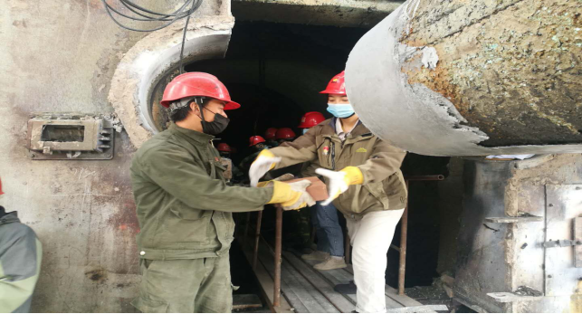 在回轉(zhuǎn)窯挖補(bǔ)窯磚現(xiàn)場(chǎng),他們手傳手,開展接力,窯磚補(bǔ)填……