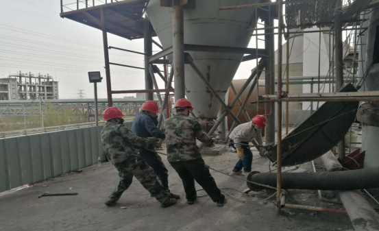 在清理結(jié)皮現(xiàn)場,面對預(yù)熱器本身設(shè)備的炙烤外,還有夏季本身炎熱,而他們在每一處作業(yè)點(diǎn),都是那樣“激戰(zhàn)正酣”,他們輪流揮舞著大錘敲打著鋼釬,熟練、小心的用著“水炮”,一遍又一遍,敲碎了“結(jié)皮”,疏通了管道,每一點(diǎn)都是力氣活,耗時耗力。有時候,往往一錘下去鋼釬卻絲毫不動,但我沒從他們臉上看到灰心的表情。12個小時的工作量,但從井然有序的場面我仍然可以看出他們有分工也有協(xié)作,同時銘記安全第一。