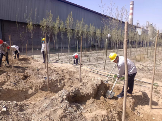 近中午12時許,樹苗到廠。下午14時,參加植樹的同志們個個熱情洋溢、干勁十足,以飽滿的熱情投入到播種綠色的植樹行動中。同志們扛起樹苗,齊心協(xié)力扶植,拉線擺正,鏟土培實、澆水灌溉,三人成組、五人成團,細(xì)心呵護,每個環(huán)節(jié)有條不紊,每道工序都認(rèn)真對待。