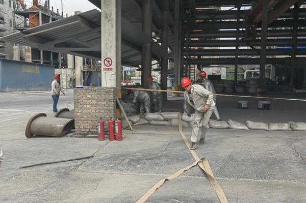 各應(yīng)急救援小組到達(dá)現(xiàn)場,根據(jù)職責(zé)分工全力做好搶險(xiǎn)準(zhǔn)備工作。治安救護(hù)組按程序組織對現(xiàn)場設(shè)立警戒線,做好人員控制及疏散、道路疏通工作,生產(chǎn)保障組落實(shí)其他裝置生產(chǎn)及現(xiàn)場防汛情況,同時(shí)組織進(jìn)行滅火;搶險(xiǎn)搶修組現(xiàn)場進(jìn)行圍堰堵水并疏通排水溝。搶險(xiǎn)搶修結(jié)束后,對事故隱患再次進(jìn)行排查、消除,并有序恢復(fù)現(xiàn)場生產(chǎn)作業(yè)。