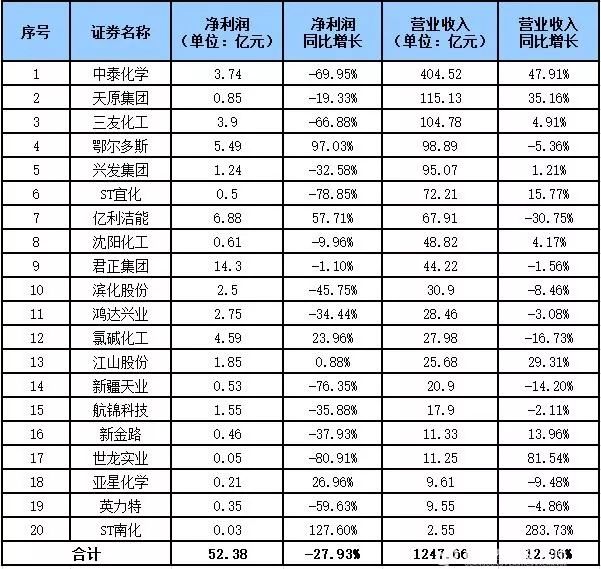 上市公司2019年度的半年報已披露完畢。廣東塑料交易所統(tǒng)計了新疆天業(yè)、中泰化學、英力特、鴻達興業(yè)等20家氯堿行業(yè)上市公司上半年的業(yè)績情況,合計實現(xiàn)營收1247.66億元,同比增長12.96%,凈利潤52.38億元,同比下降27.93%;雖然利潤出現(xiàn)下滑,但上半年這20家上市公司全部實現(xiàn)盈利。