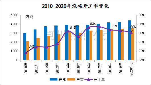 燒堿市場(chǎng)行情走勢(shì)與市場(chǎng)供需情況往往存在密切的聯(lián)系,而供應(yīng)方面的變化主要來(lái)自于產(chǎn)能的改變,今日我們百川從供應(yīng)角度分析2010-2020年燒堿產(chǎn)能變遷情況;2010-2015年中國(guó)燒堿處于飛速擴(kuò)展,供應(yīng)的激增導(dǎo)致產(chǎn)品價(jià)格偏低,2013年開(kāi)始廠家擴(kuò)產(chǎn)趨于理性,2015年中國(guó)燒堿產(chǎn)能增長(zhǎng)率為-1.2%。