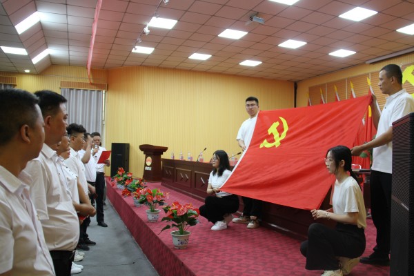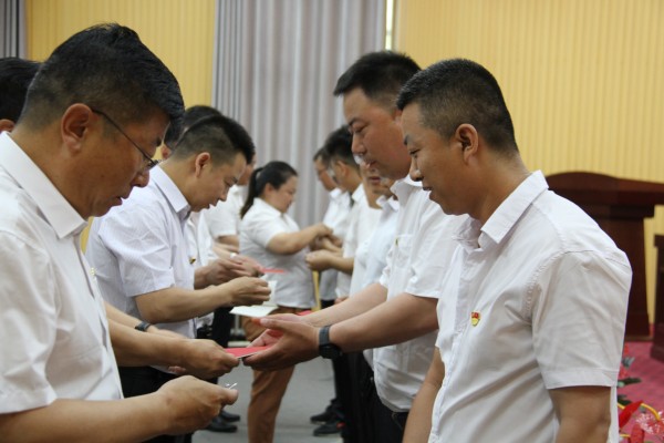 黨委領(lǐng)導(dǎo)班子為新黨員佩戴黨徽,頒發(fā)《黨章》。