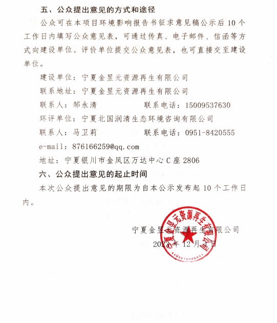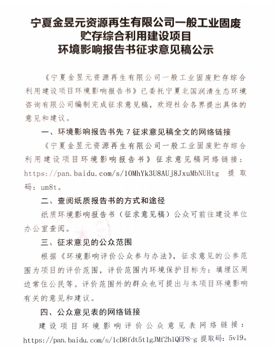 寧夏金昱元資源再生有限公司一般工業(yè)固廢貯存綜合利用建設(shè)項目征求意見稿公示