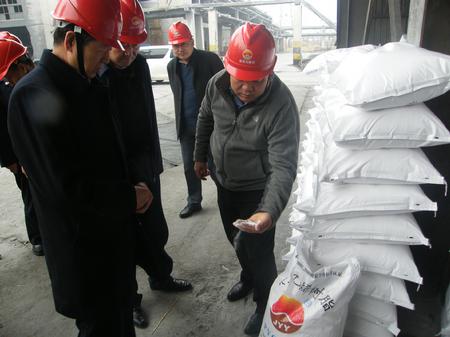 金昱元公司董事長代良云為自治區(qū)國稅局副局長陳連書介紹公司主要產(chǎn)品PVC樹脂的生產(chǎn)過程